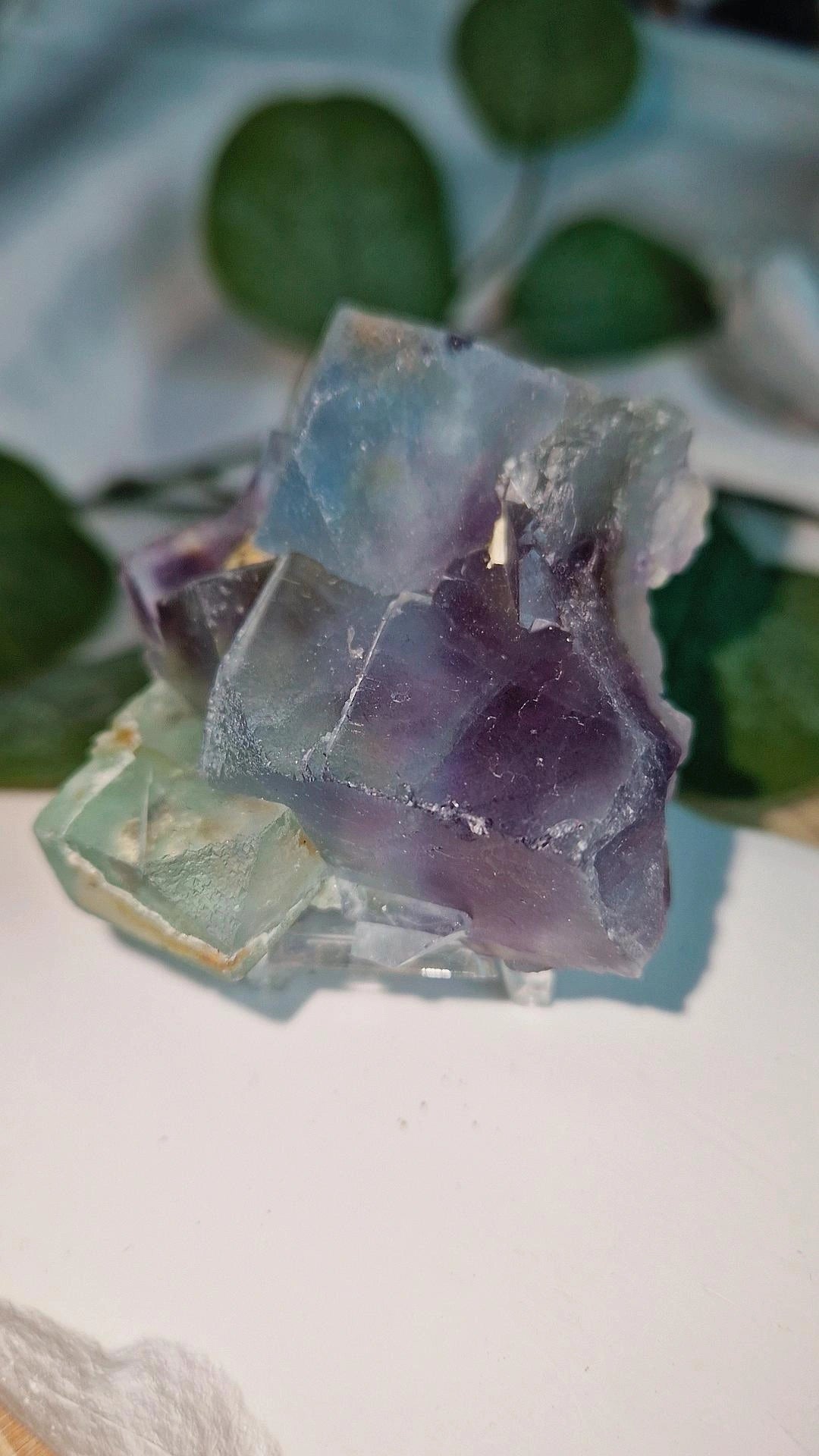 grüngelb & blauer Fluorit mit wunderschönen, deutlichen und klaren violetten Phantomen.